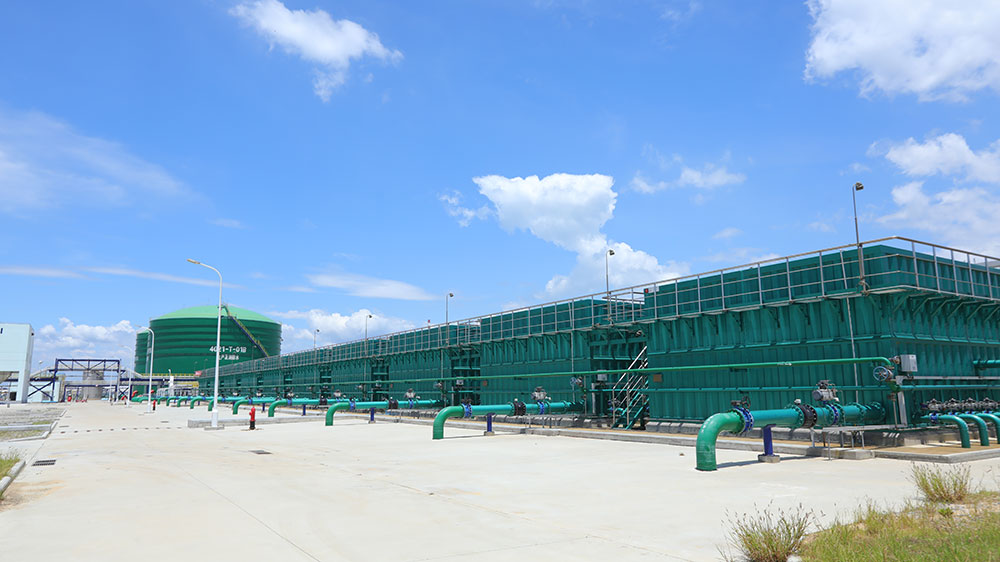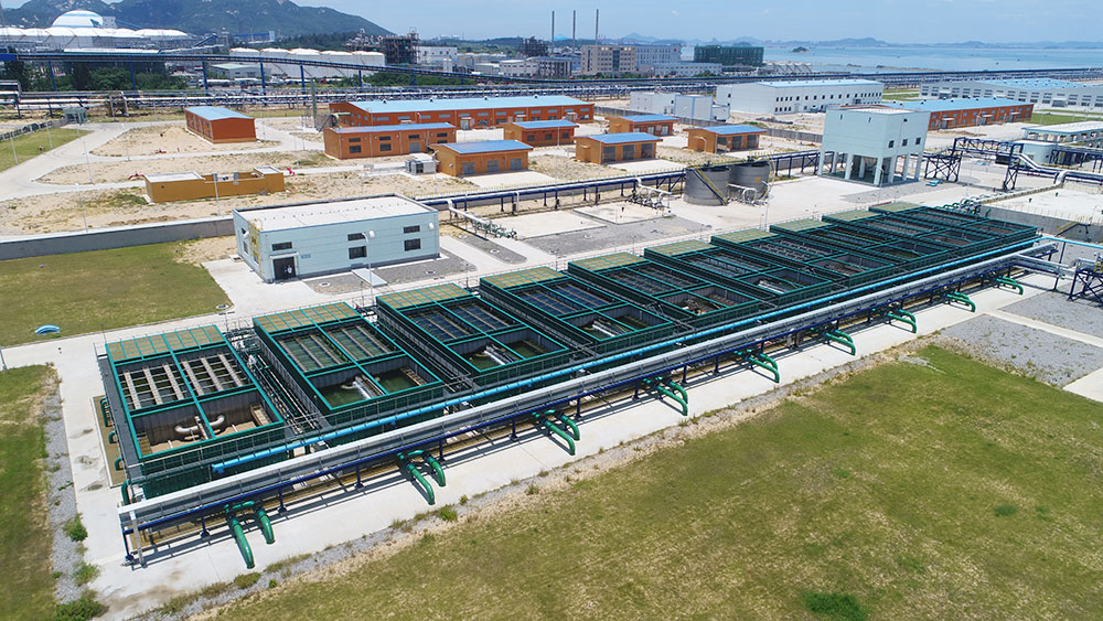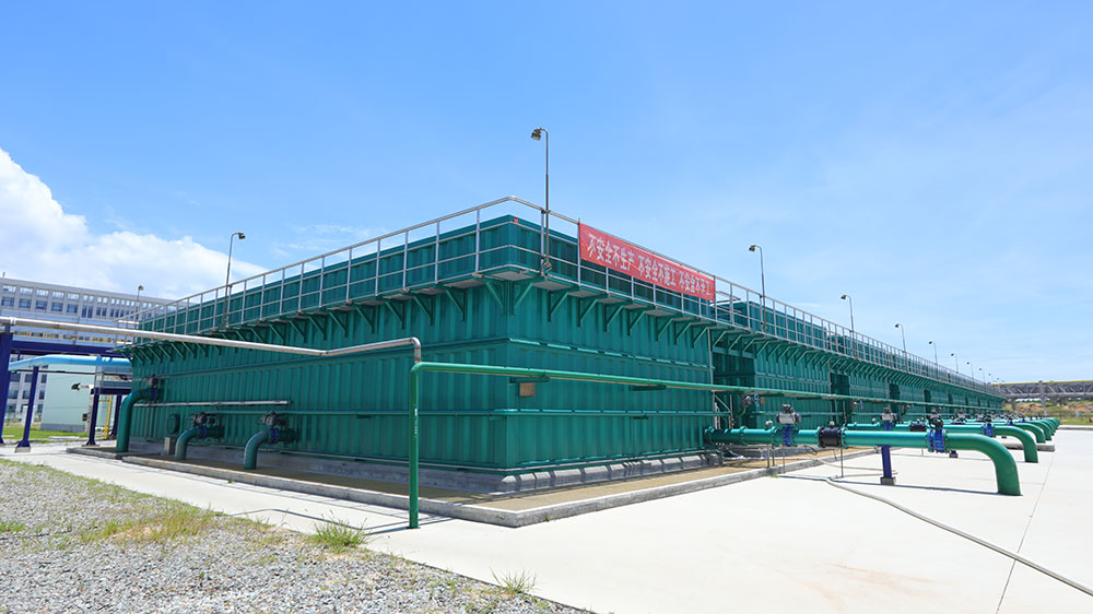 福建漳州古雷煉化一體化項目:位于福建省漳州市古雷半島,建設規模10萬噸,采用了絮凝、沉淀、過濾、消毒工藝,原水輸送至凈水廠后,通過入水管道上的管道混合器投加絮凝劑并進行充分混合后,經絮凝、沉淀、過濾后重力流輸送至清水池,通過傳輸泵將凈化水轉輸至生產給水系統。當模塊化凈水設備過濾水頭損失達到一定程度時,自動開啟反沖洗水泵及風機,對凈水設備進行氣水反沖洗。